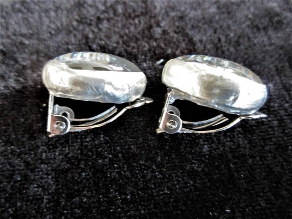Oorclips van doorzichtige glasparels van blank glas, tegen een zilverkleurige ondergrond