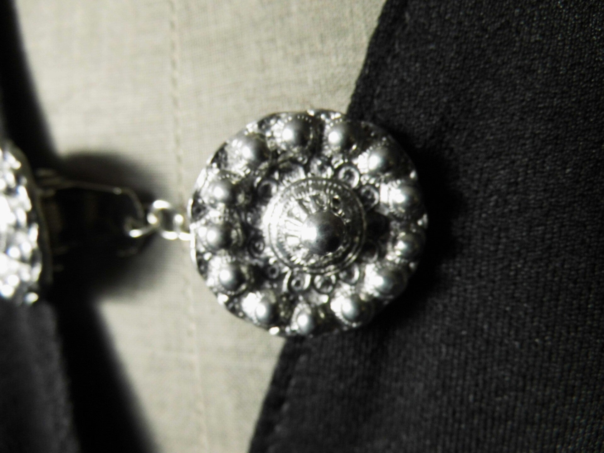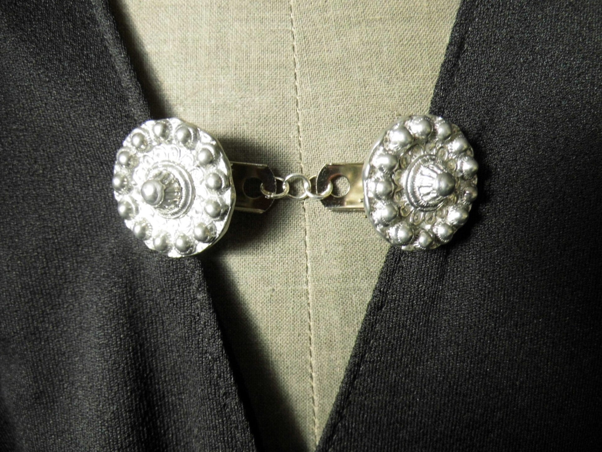 Vestclip gemaakt van twee met de hand gegoten zeeuwse knoppen van zilvertin, stevig gesoldeerd op een handig klemmetje. Twee van deze klemmetjes zijn door middel van ringetjes aan elkaar bevestigd, waardoor deze te gebruiken zijn als sluiting voor een vest zonder knopen of om een omslagdoek of shawl op z'n plaats te houden.