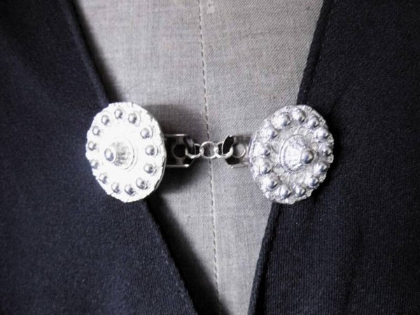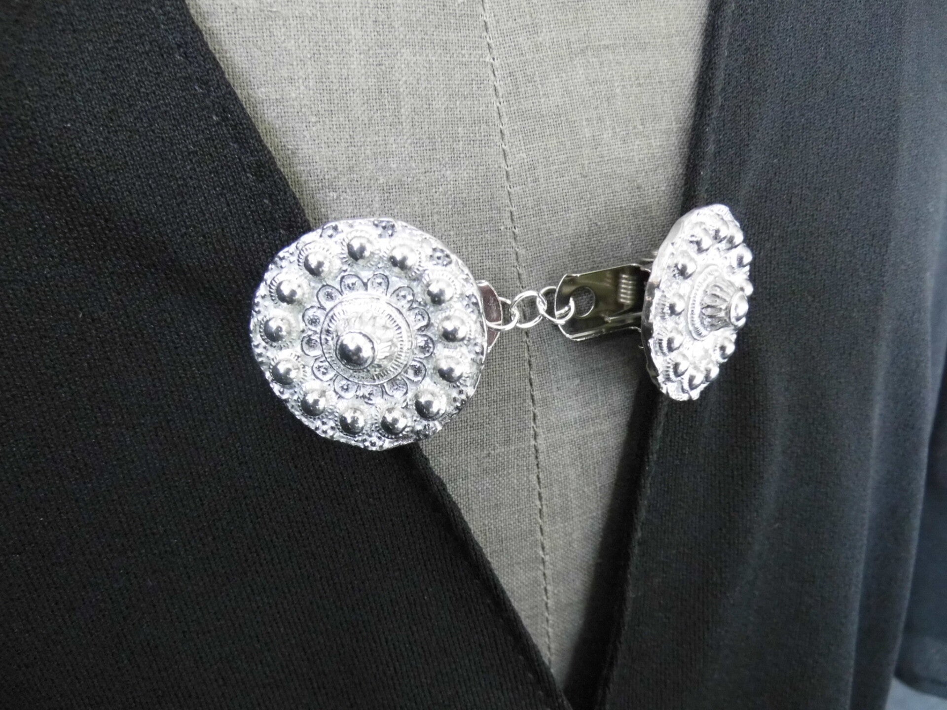 Vestclip gemaakt van twee zeeuwse knoppen met rustieke rand, met de hand gegoten van zilvertin, stevig gesoldeerd op een handig klemmetje. Twee van deze klemmetjes zijn door middel van ringetjes aan elkaar bevestigd, waardoor deze te gebruiken zijn als sluiting voor een vest zonder knopen of om een omslagdoek of shawl op z'n plaats te houden.