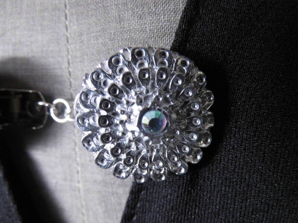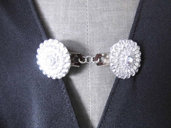 Vestclip gemaakt van twee knoppen "Brit" met de hand gegoten van zilvertin met in het midden een mooie regenboogstrass, stevig gesoldeerd op een handig klemmetje. Twee van deze klemmetjes zijn door middel van ringetjes aan elkaar bevestigd, waardoor deze te gebruiken zijn als sluiting voor een vest zonder knopen of om een omslagdoek of shawl op z'n plaats te houden.