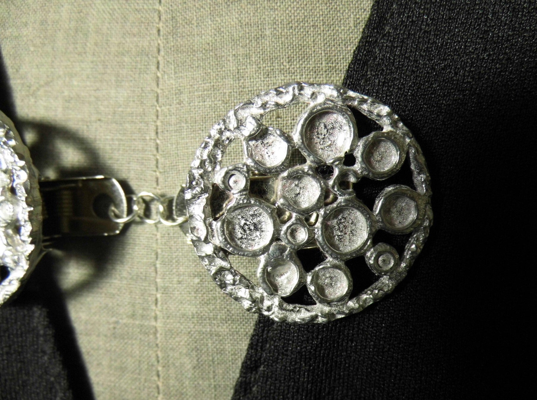 Vestclip gemaakt van twee knoppen "Maan" met de hand gegoten van zilvertin, stevig gesoldeerd op een handig klemmetje. Twee van deze klemmetjes zijn door middel van ringetjes aan elkaar bevestigd, waardoor deze te gebruiken zijn als sluiting voor een vest zonder knopen of om een omslagdoek of shawl op z'n plaats te houden.