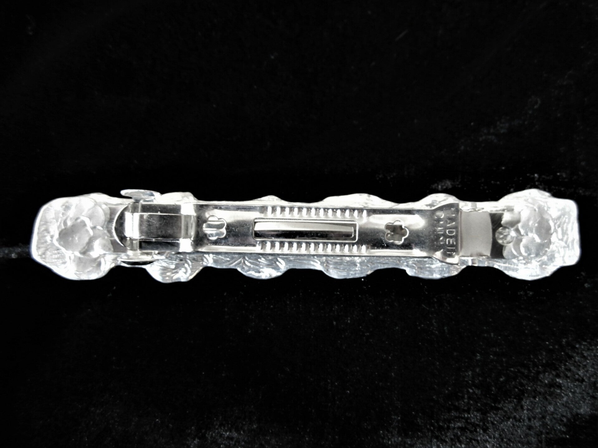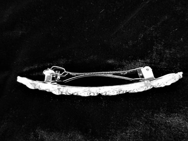 Haarclip / haarspeld met een afbeelding van een rij roosjes; van ambachtelijk gegoten tin. Stevig gesoldeerd op een haarclip van ± 6x1cm