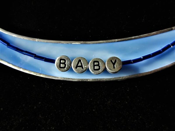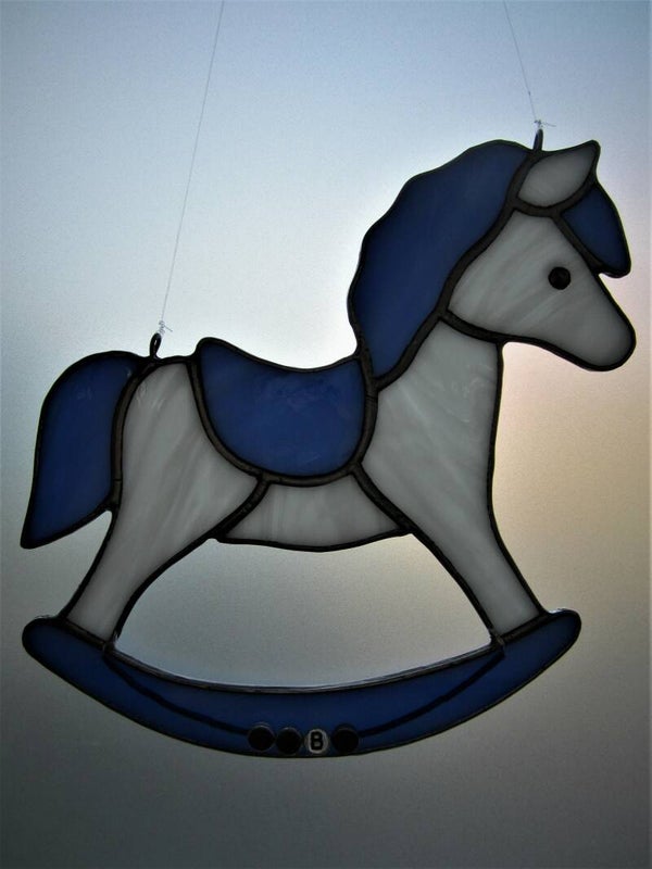 Unieke handgemaakte raam- of wandhanger model hobbelpaard. Van wit met blauw opaalglas. Leuk voor de babykamer. Op bestelling te maken met de naam van de baby; aantal letters in overleg. Een zeer origineel kraamcadeau / naamcadeau!