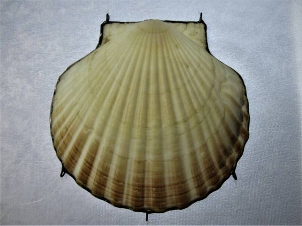 Raamhanger van een echte Sint-Jacobsschelp, met drie visjes van verschillende soorten/kleuren zeegroenglas.