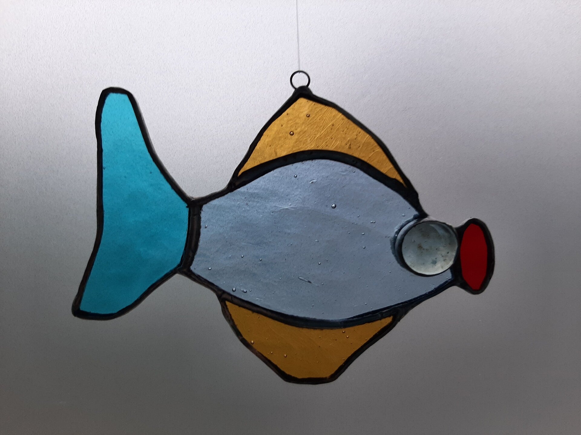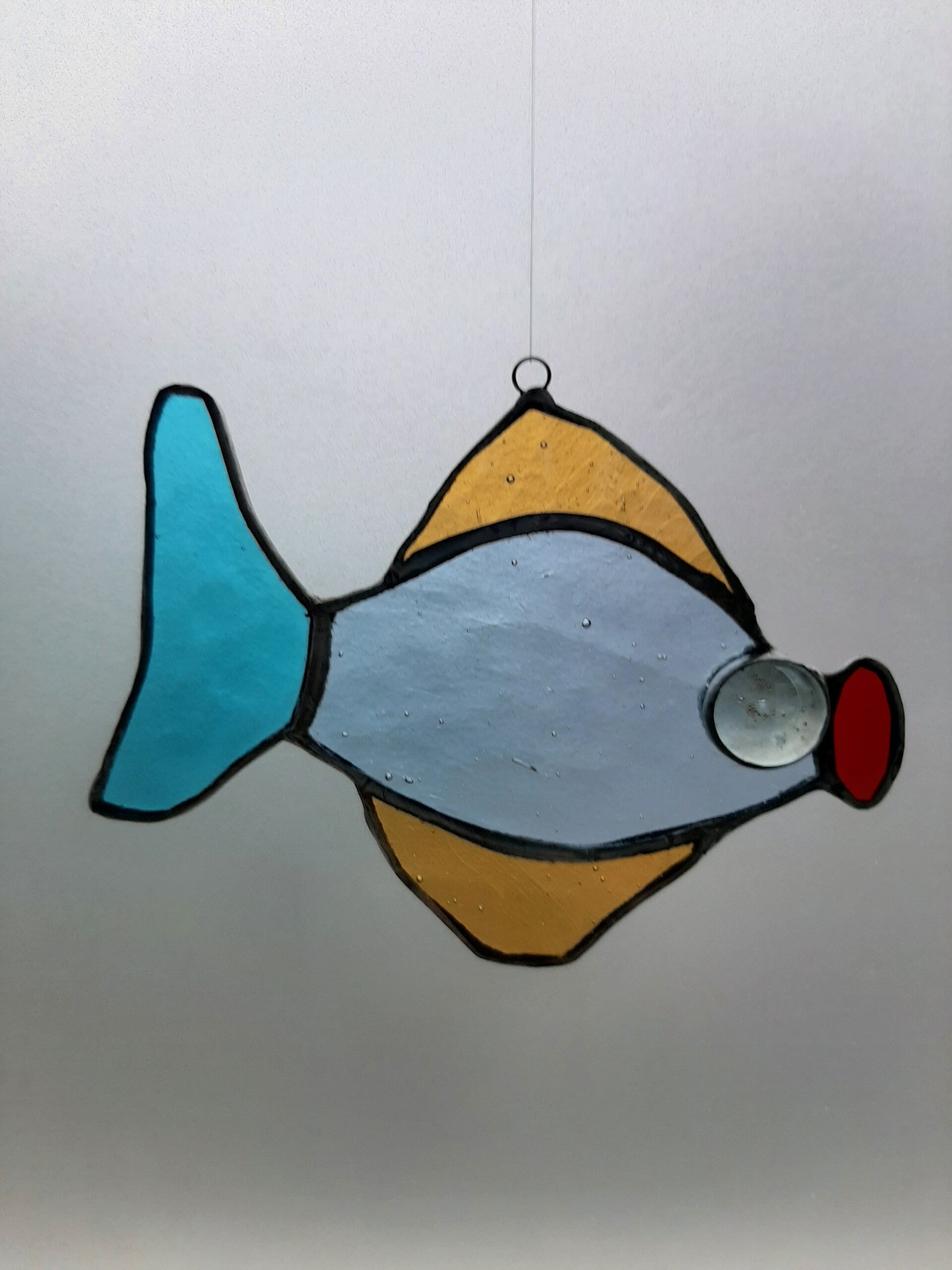 Raamhanger in de vorm van een vis van meerdere kleuren transparant glas met ogen van glasparels; met ophang-oogje; handgemaakt dmv tiffany/koperfolie-techniek