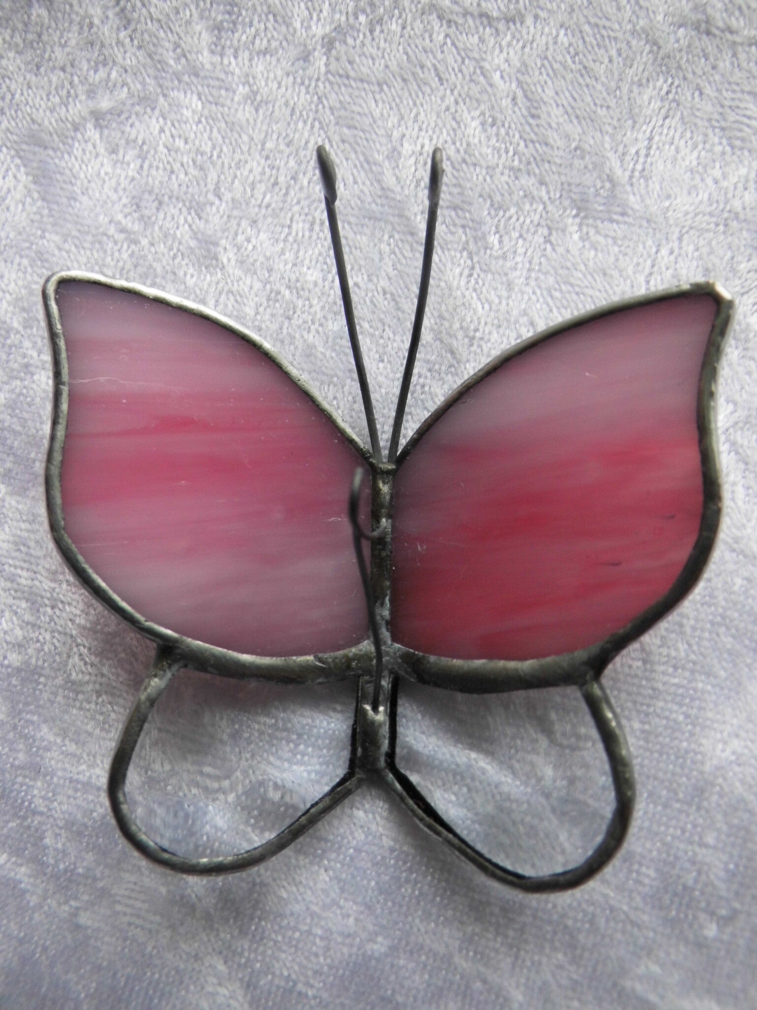 vlindertje van roze opaal- met blank transparant glas; met ophang-oogje; handgemaakt dmv tiffany/koperfolie-techniek