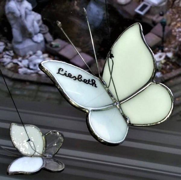 vlindertje van geel opaal- met geel transparant glas; met ophang-oogje; handgemaakt dmv tiffany/koperfolie-techniek