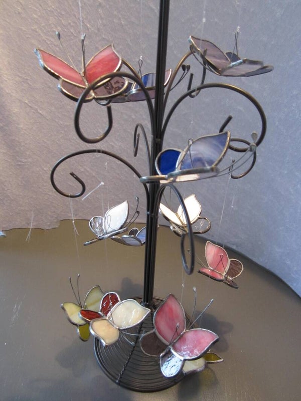 vlindertje van paars/lila opaal- met lila transparant glas; met ophang-oogje; handgemaakt dmv tiffany/koperfolie-techniek
