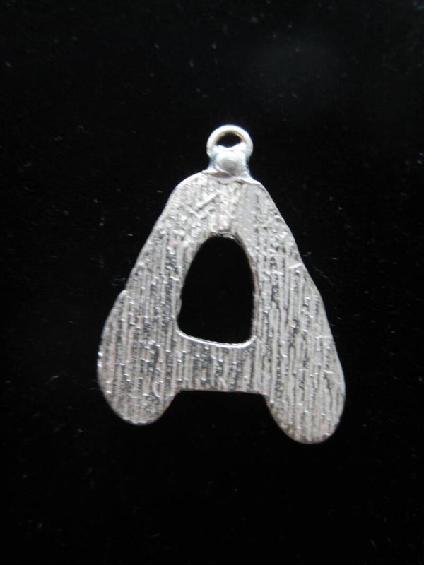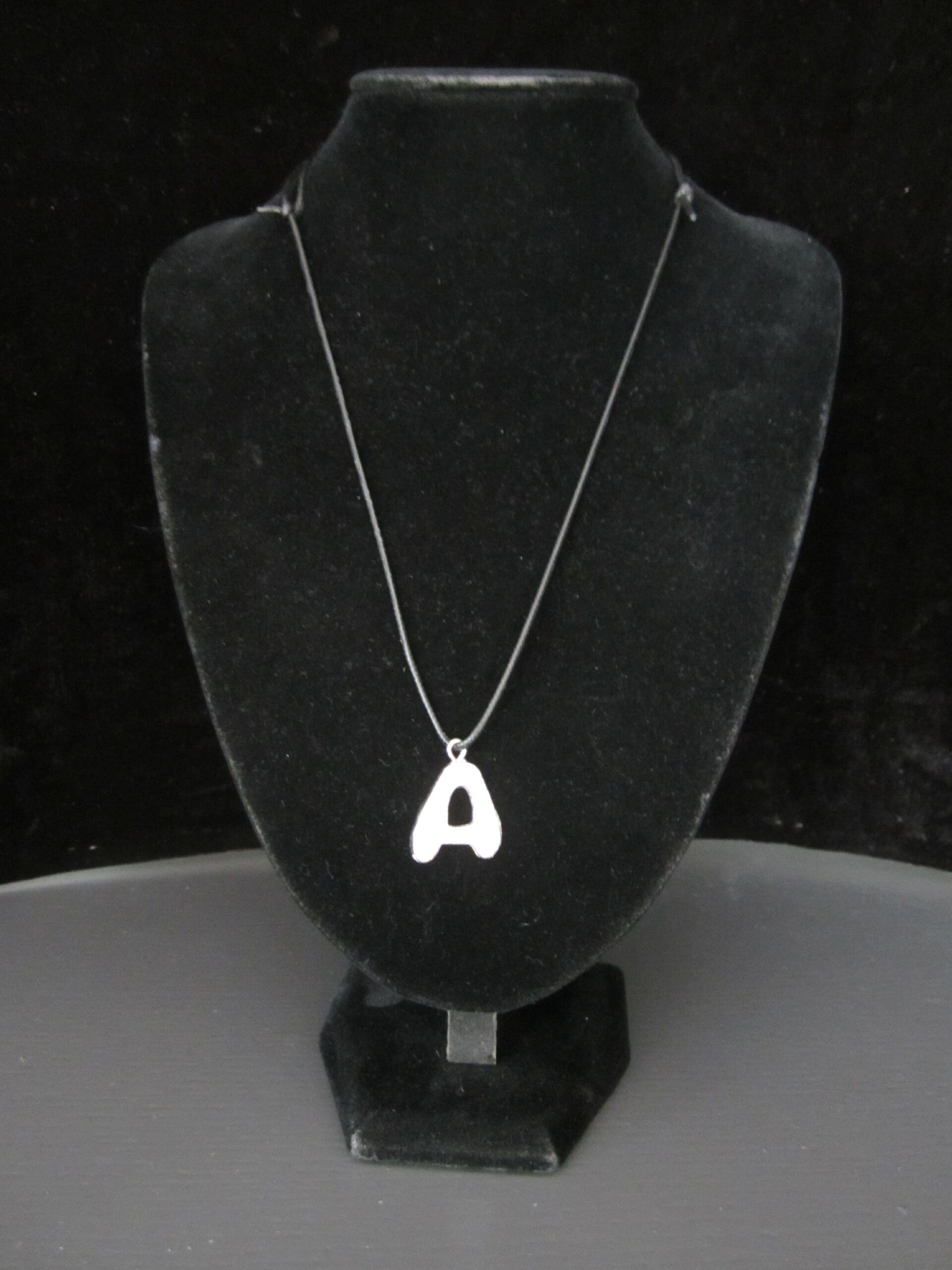 Ambachtelijk gegoten sierletter van zilvertin aan een waxkoordje. Hoogte van de letter inclusief ringetje ongeveer 25mm.