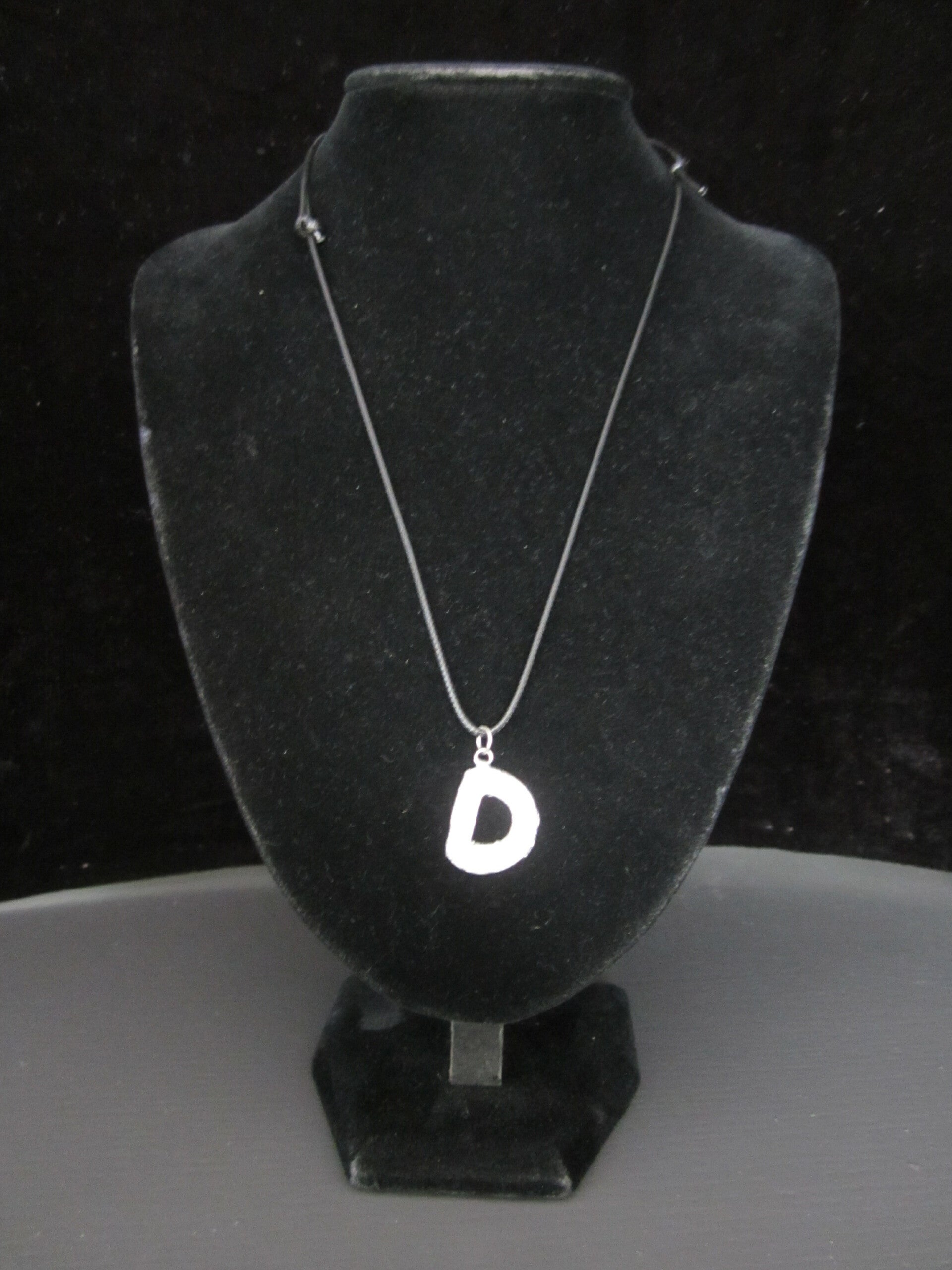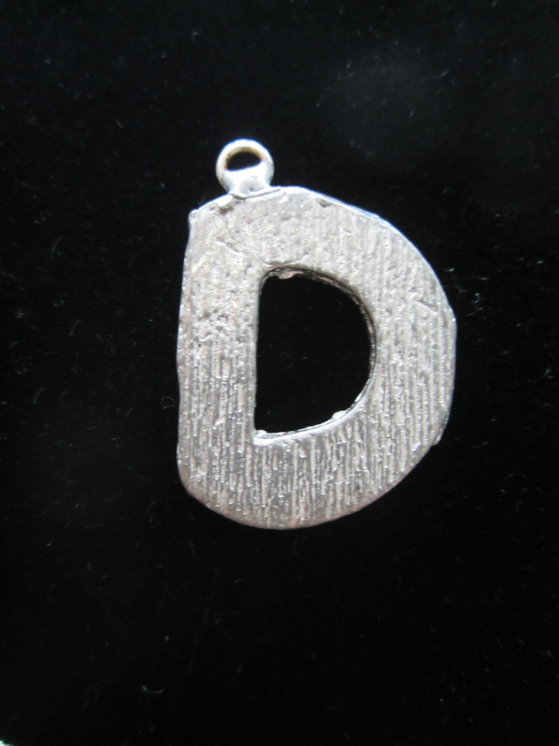 Ambachtelijk gegoten sierletter van zilvertin aan een waxkoordje. Hoogte van de letter inclusief ringetje ongeveer 25mm.