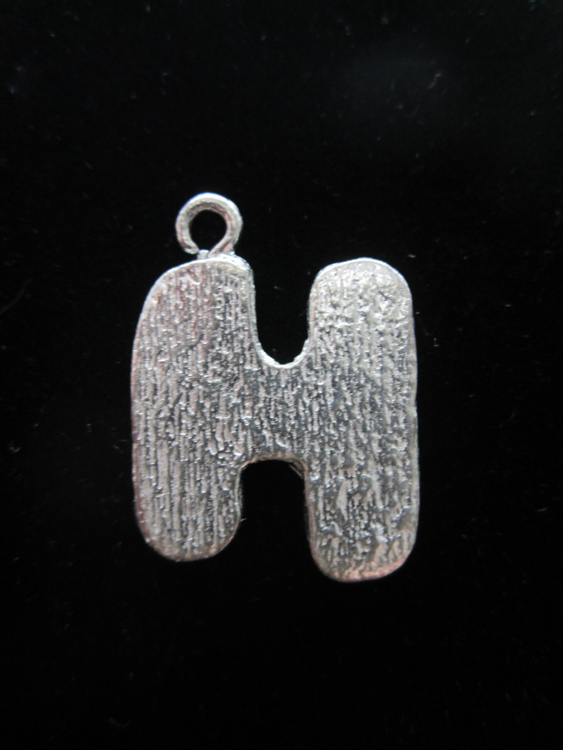 Ambachtelijk gegoten sierletter van zilvertin aan een waxkoordje. Hoogte van de letter inclusief ringetje ongeveer 25mm.