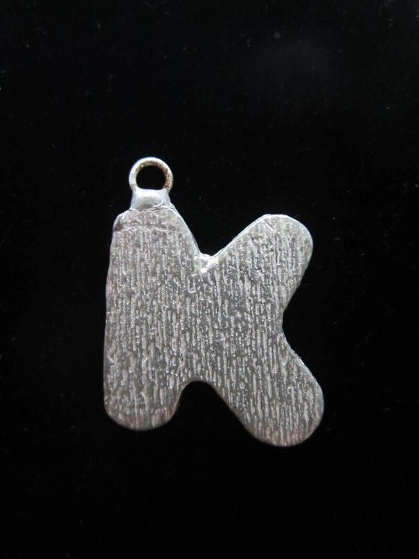 Ambachtelijk gegoten sierletter van zilvertin aan een waxkoordje. Hoogte van de letter inclusief ringetje ongeveer 25mm.