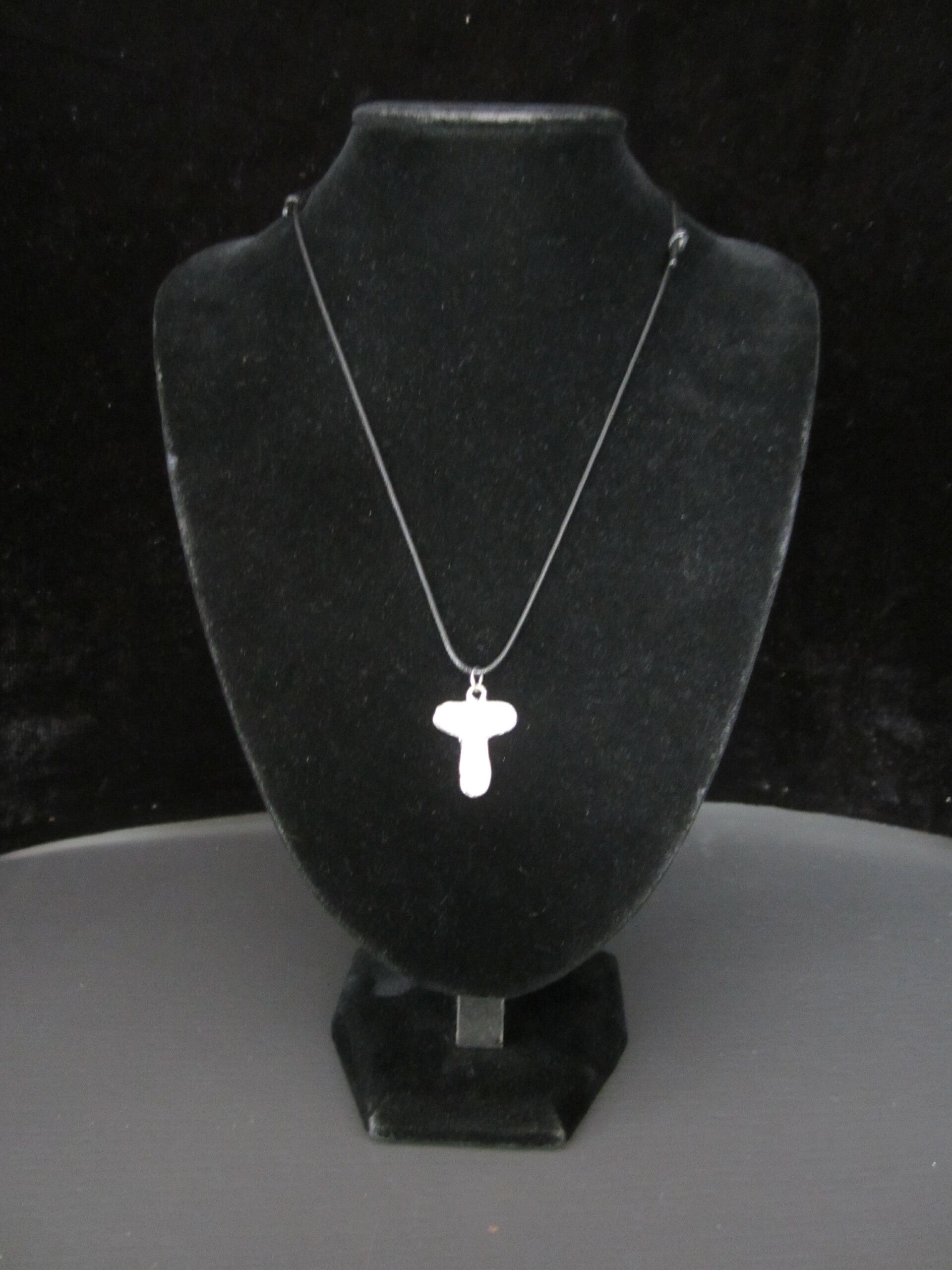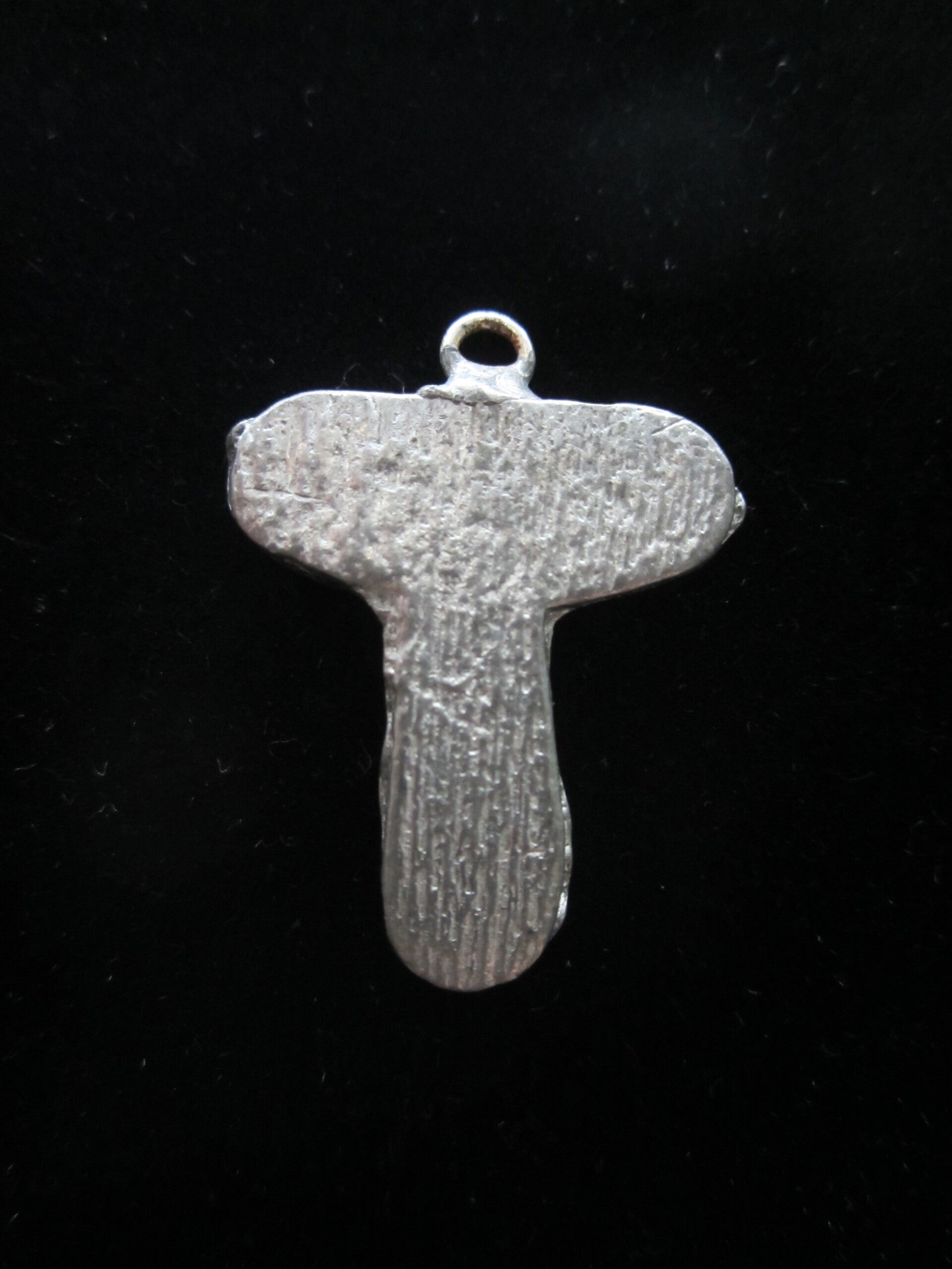 Ambachtelijk gegoten sierletter van zilvertin aan een waxkoordje. Hoogte van de letter inclusief ringetje ongeveer 25mm.