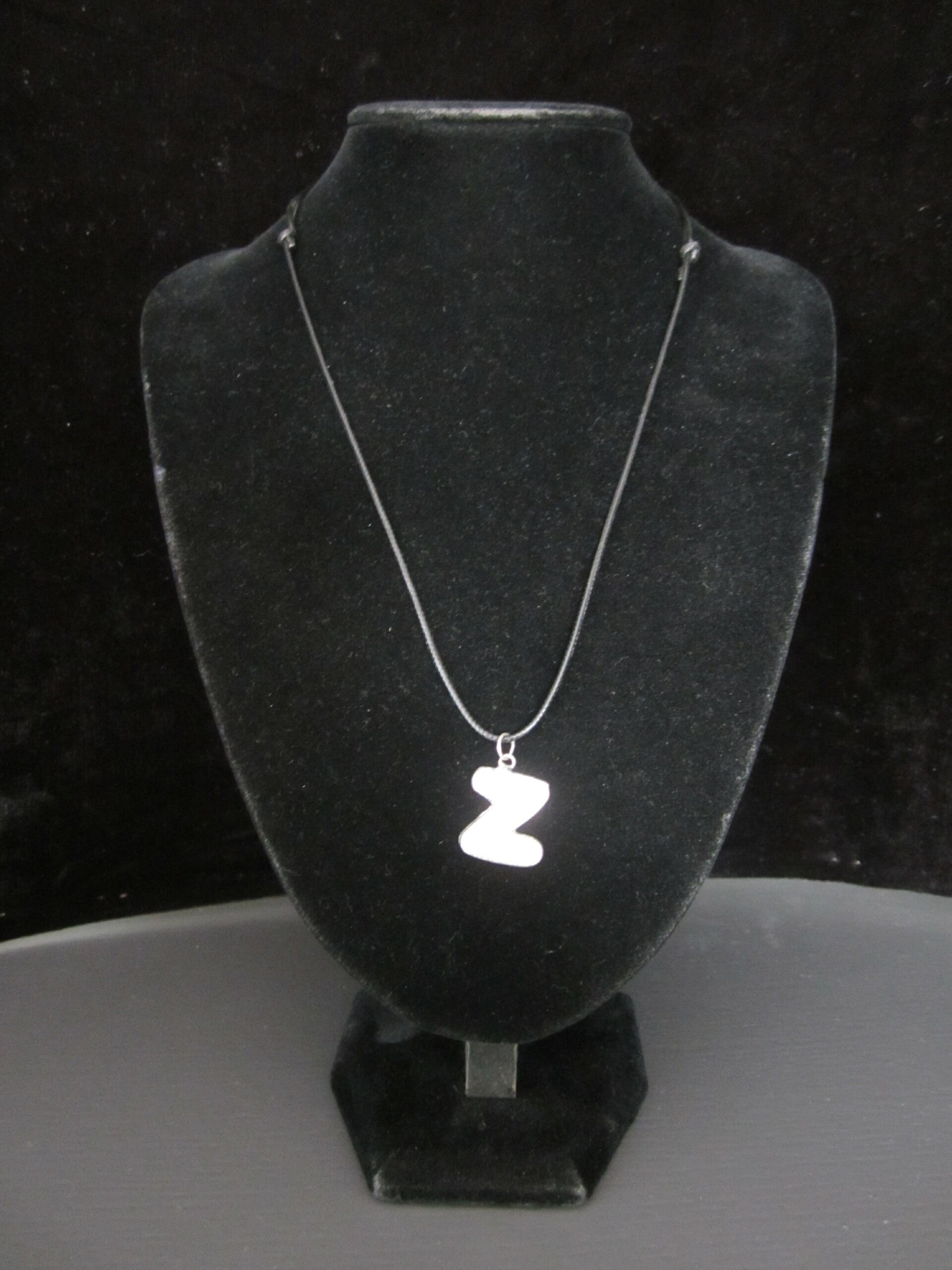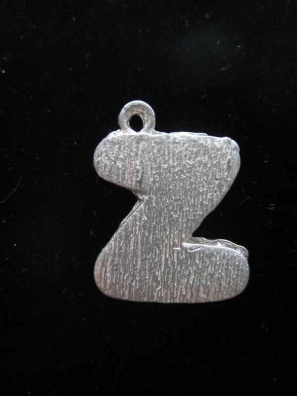 Ambachtelijk gegoten sierletter van zilvertin aan een waxkoordje. Hoogte van de letter inclusief ringetje ongeveer 25mm.