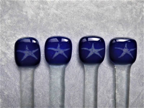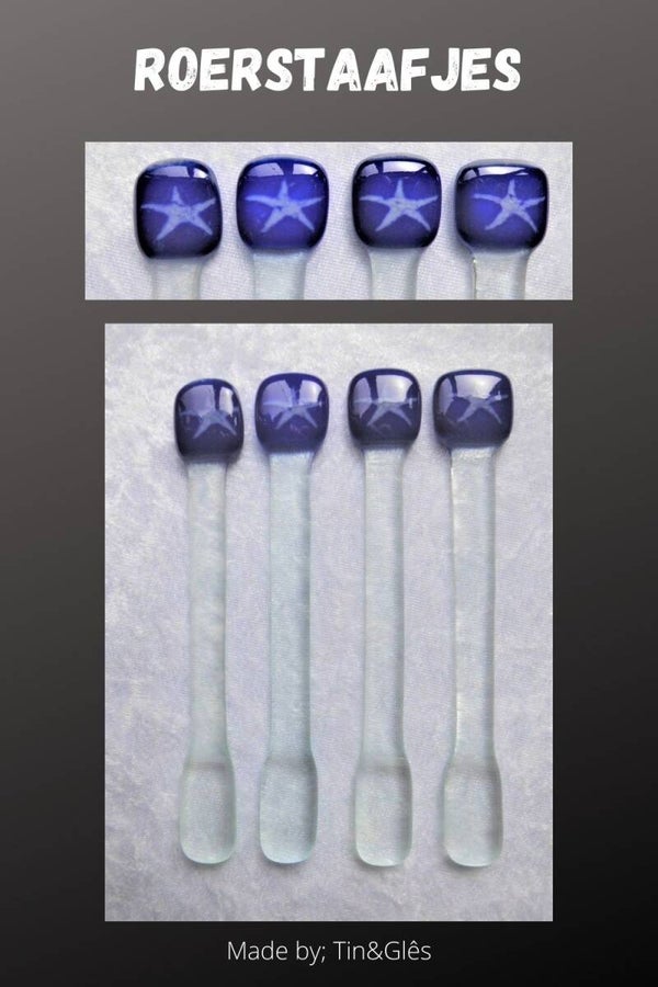 Glazen roerstaafje van blank glas met aan de bovenkant een wit zeesterretje op een blauwe achtergond