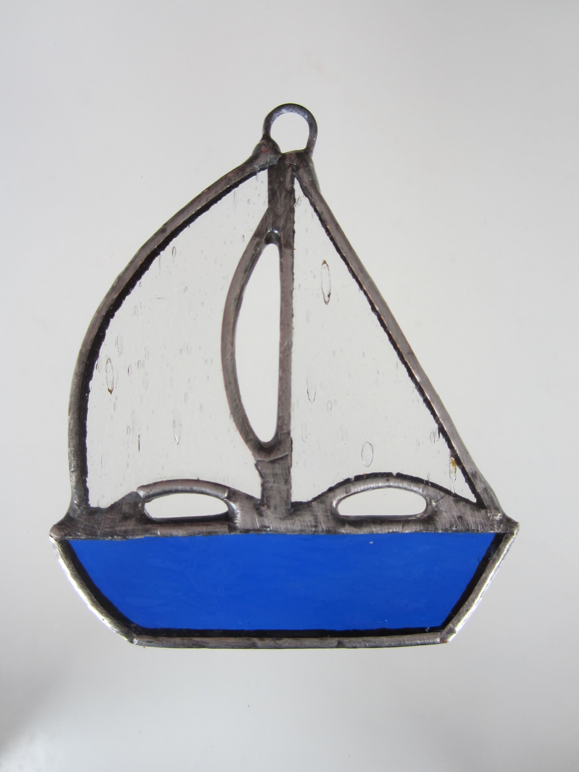 Zeilbootje van blauw kathedraal glas, met zeilen van blank glas; met ophang-oogje; handgemaakt dmv tiffany/koperfolie-techniek