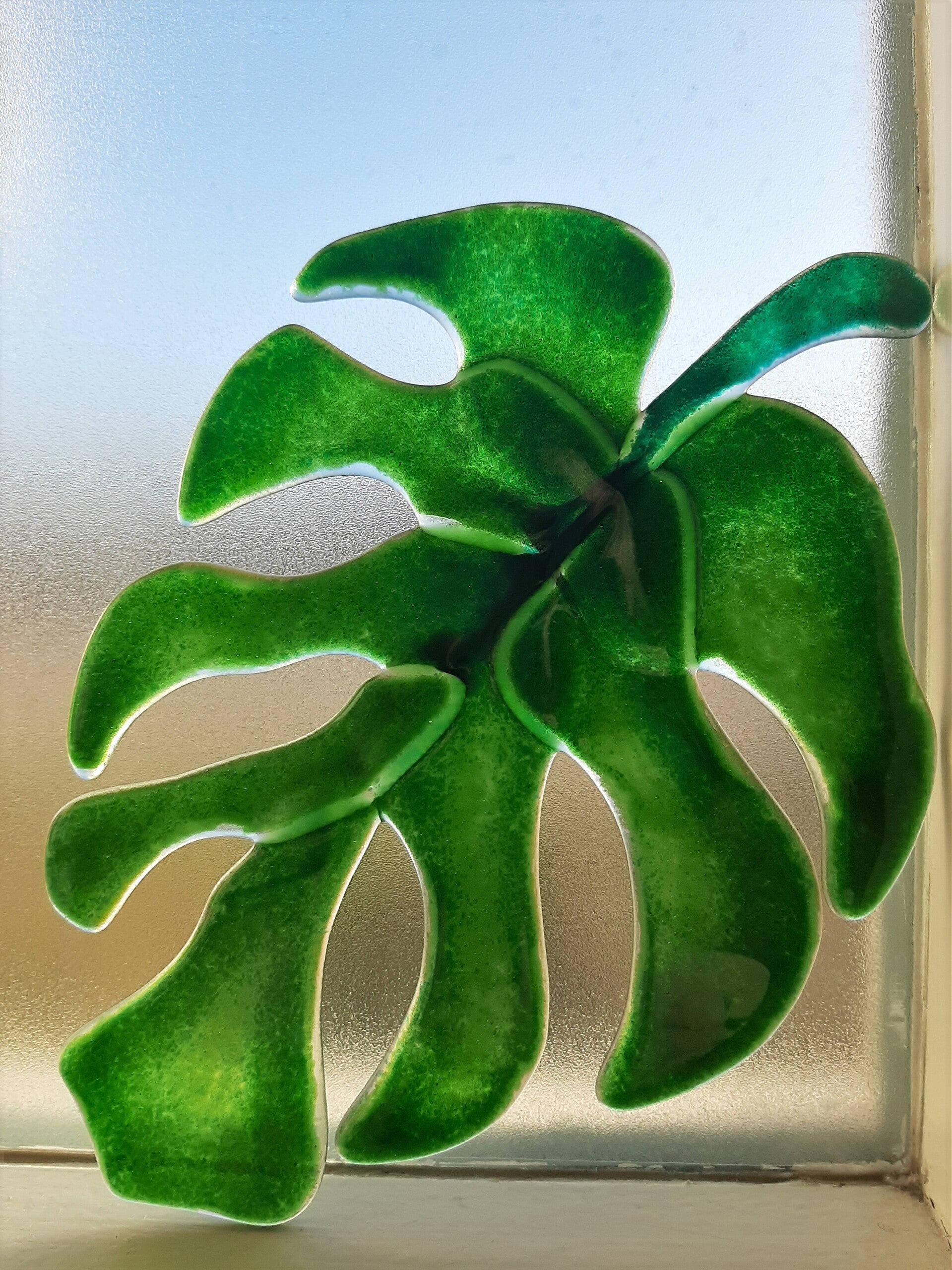 Raamhanger in de vorm van een Monstera-blad; gemaakt van glas door middel van glasfusing (smelten van glas bij hoge temperatuur in een speciale glasoven) Ook mooi om gewoon in de hoek van een raam te zetten.