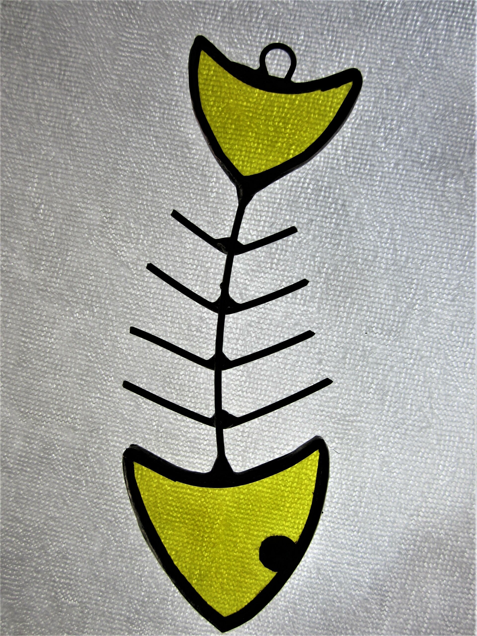 Gratenvisje van geel doorzichtig kathedraalglas met graatje van ijzerdraad; met ophang-oogje; handgemaakt dmv tiffany/koperfolie-techniek